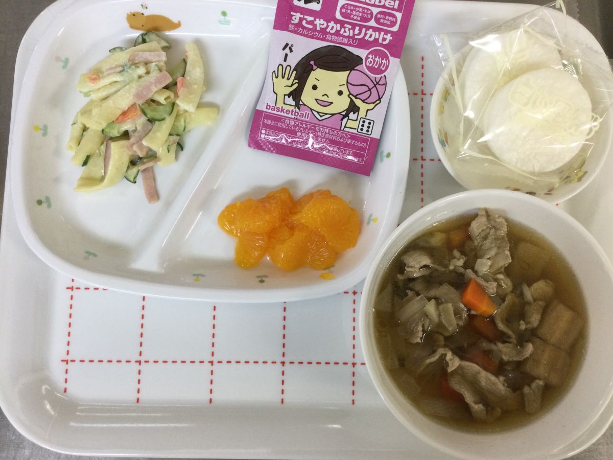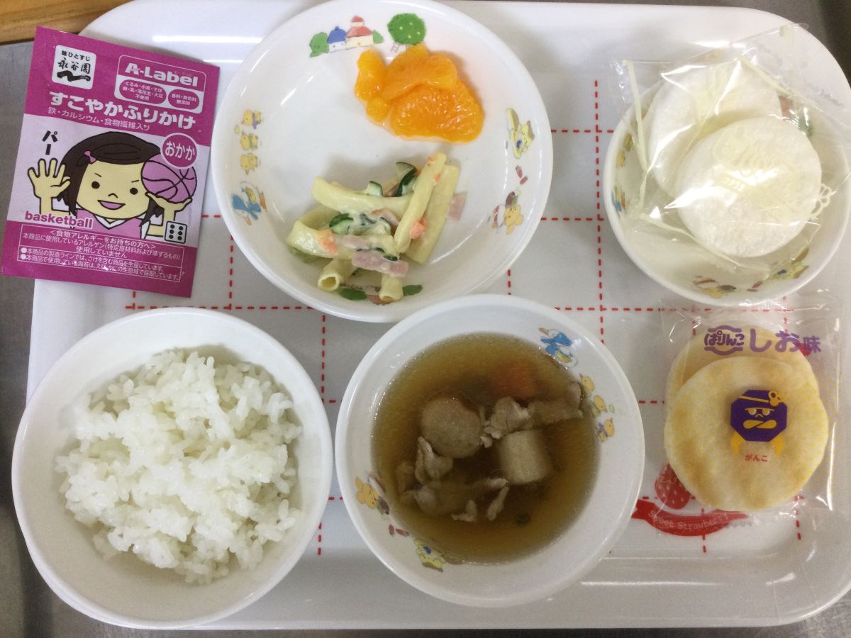 ●給食すき焼き風煮、マカロニサラダ、みかん缶、ふりかけ●3時のおやつお茶、クリームサンドせんべい✳︎写真2枚目✳︎●未満児給食●10時のおやつ牛乳、塩せんべい⚫︎離乳食(写真3枚目)タラの煮付け、じゃがいもと玉ねぎの煮物、人参と麩のスープ