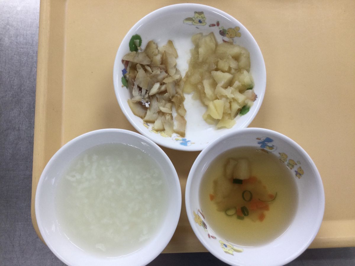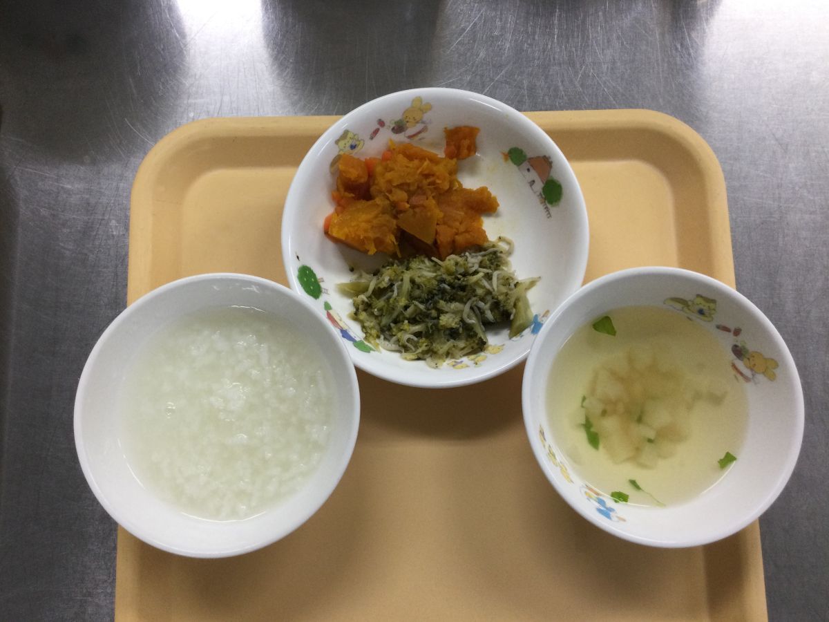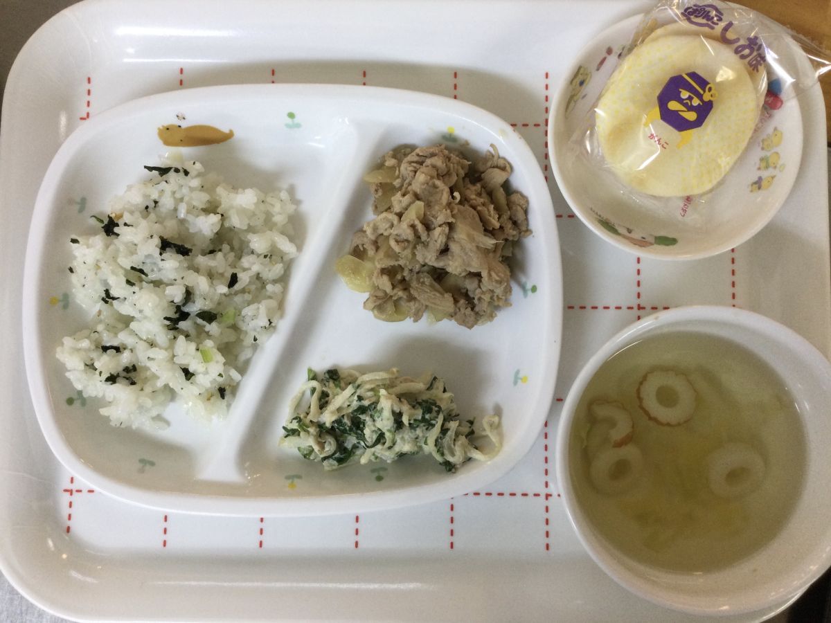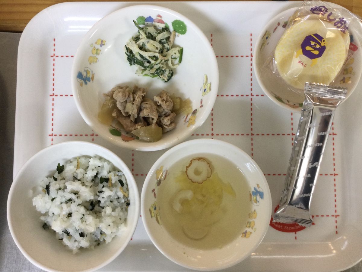 ●給食しらすわかめごはん、玉葱入り豚肉の生姜焼き、切り干し大根サラダ、ちくわと白菜のすまし汁●3時のおやつお茶、塩せんべい✳︎写真2枚目✳︎●未満児給食●10時のおやつ牛乳、ウエハース⚫︎離乳食(写真3枚目)タラの煮付け、かぼちゃと大根の煮物、白菜と麩のすまし汁