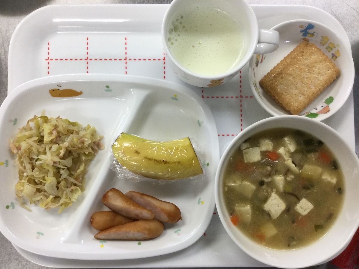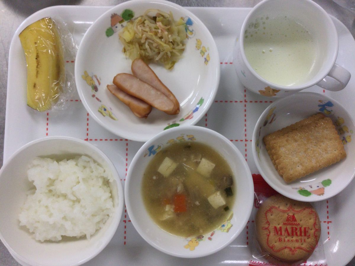 ●給食麻婆豆腐、キャベツとベーコンのソテー、ボイルウインナー、バナナ●3時のおやつミルク、サブレ✳︎写真2枚目✳︎●未満児給食●10時のおやつ牛乳、ビスケット⚫︎離乳食(写真3枚目)麻婆豆腐風煮、キャベツと玉葱の煮物、ボイルじゃが芋