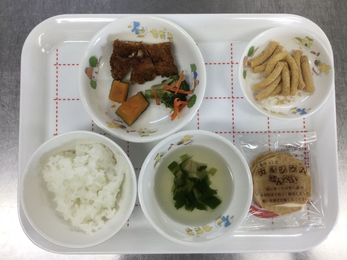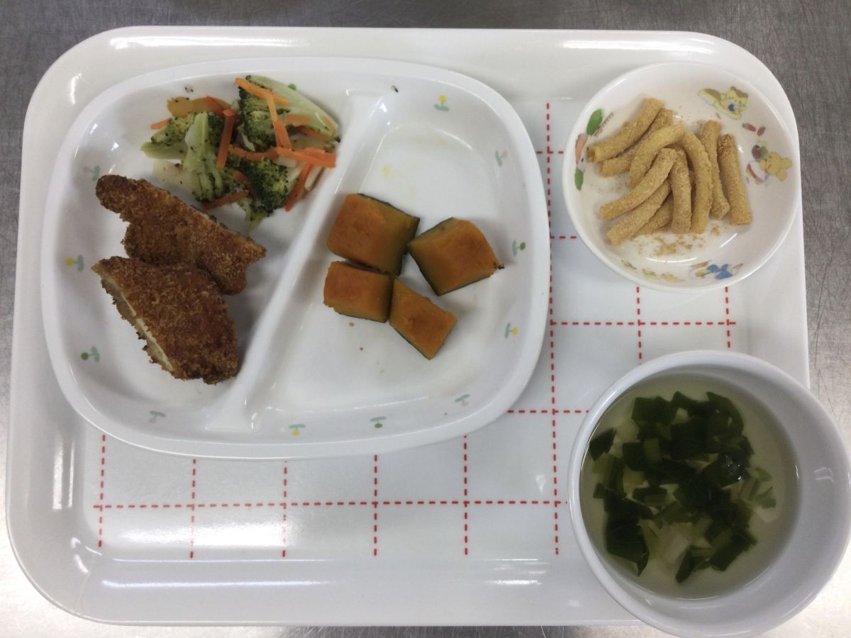 ●給食チキンカツ、ブロッコリーと人参のドレッシング和え、南瓜の含め煮、小松菜とえのきのスープ●3時のおやつお茶、マカロニきな粉✳︎写真2枚目✳︎●未満児給食●10時のおやつ牛乳、カルシウムせんべい⚫︎離乳食(写真3枚目)鮭の煮付け、ブロッコリーと人参の煮浸し、小松菜のスープ